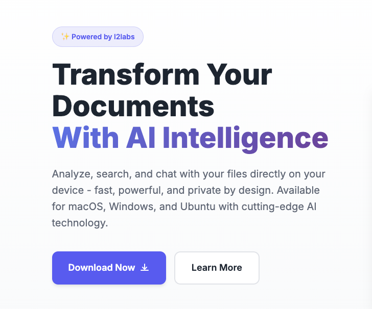 Documents AI is an intelligent document processing app that transforms how you work with files on your computer. It lets you analyze, search, and chat with your documents using AI, while keeping everything local and private by design — your files never leave your machine unless you choose otherwise. documents.l2labs.dev